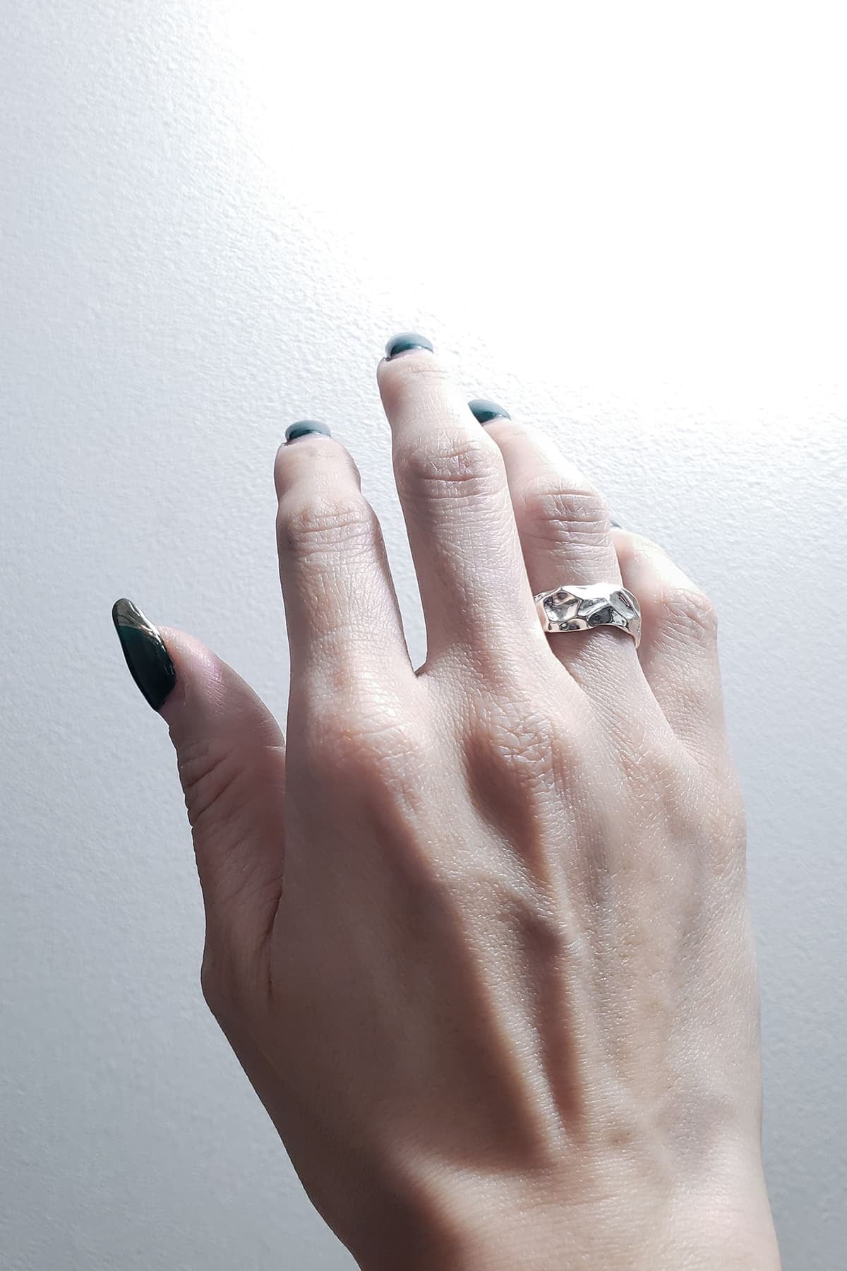 あえてランダムに打ち込まれた大きな槌目は、光を受けるたびに複雑な反射を生み出し、水面のような揺らぎのある輝きを見せます。